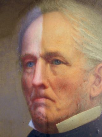 The photo on the right is a detail of the 1864 portrait of Dean College's Founder Oliver Dean during cleaning and varnish removal.