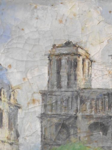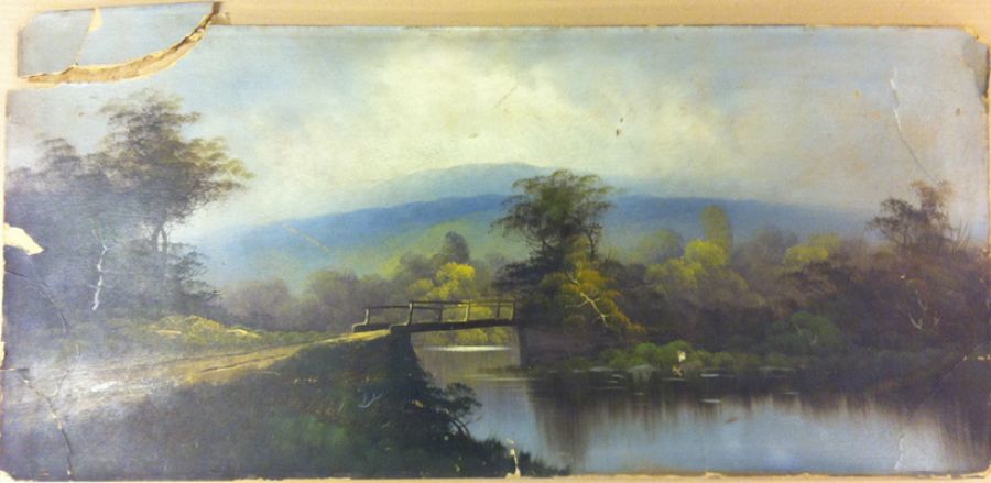 This early 20th Century oil painting on paper-board suffered from neglect and a bad fall. The fragile corners were mashed and broken, and it had several gouges in the surface. The pieces were re-assembled and mounted onto a new board for stability. Then the painting was cleaned, cracks repaired, and careful retouching finished the job.