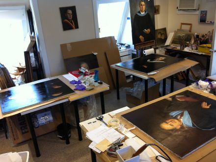 This view of our studio shows paintings of the Presidents of Dean College in various stages of cleaning and repair.